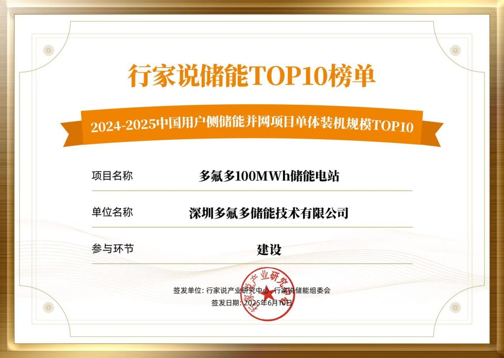 近日,由行家说储能组委会主办的“2024-2025中国用户侧储能项目评选”结果正式揭晓。由多氟多储能承建的100MWh储能电站项目成功入选“中国用户侧储能项目单体装机规模TOP10”榜单!这一荣誉不仅是对多氟多在储能领域技术实力与创新能力的认可,更是对我们在推动绿色能源发展中所作贡献的高度肯定。